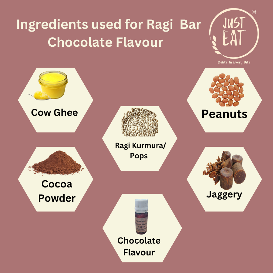 Ingredients : Ragi  Kurmura, Peanut , Jaggery  ,  Dark Cocoa Powder , Cow Ghee,  Nature Identical Flavour  ( Chocolate Flavour)